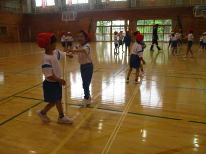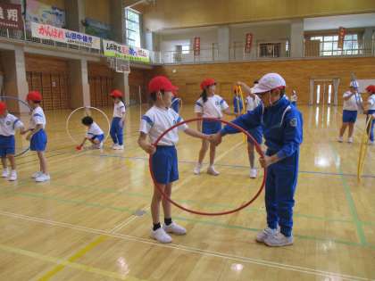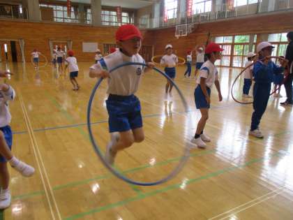 今日はフープを使い体を動かしました。二人組になって手をつなぎながら輪をくぐったり、前回りをしたりしました。子供たちはどうしたら上手くフープを回せるかを考えて、工夫していました。