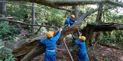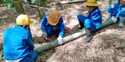 午後は森の家づくりです。 竹を組み合わせて作っています。