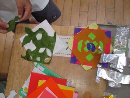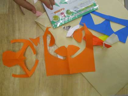 おりがみを折って、はさみで色々な形に切っていきます。本人もどんな形になるかは広げてみないとわかりません。子供たちは臆することなく切っていきます。「みてみて、こんな形になったよ」「友達と作品をつなげたいな」「紙を重ねたらもっと素敵になったよ」子供たちの個性があふれた作品がたくさんできています。