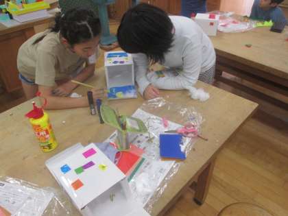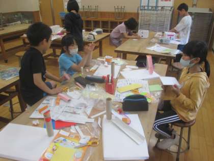 子供たちは、友達と作品を見せ合い、様々なアイディアを出し合いながら作っていました。作品が仕上がるのが楽しみです。