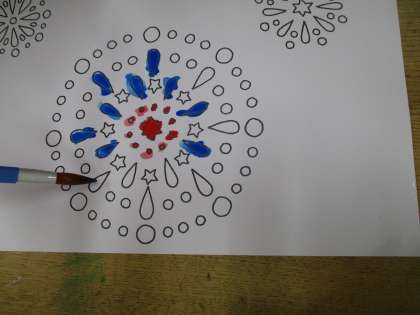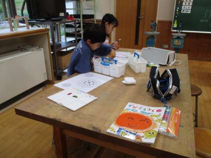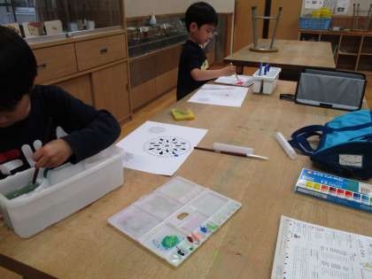 はじめてパレットに全色の絵の具を入れました。子供たちは水を混ぜたり、他の色を混ぜたりどんどん試していきます。「色が濃いところと薄いところができたよ」「おもしろい色になったよ」それぞれ工夫して色づけしていました。