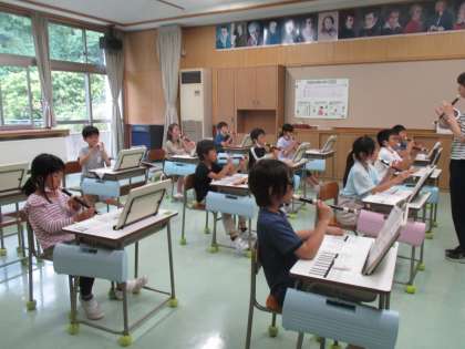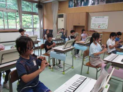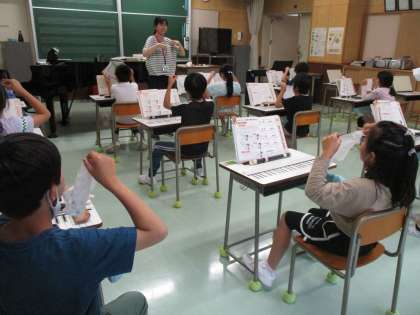 リコーダーではじめて音を出しました。はじめは思っていたより良い音が出ないと苦戦していた子供たちでした。しかし、ティッシュを使い息の吹き方を練習するときれいな音が出はじめました。