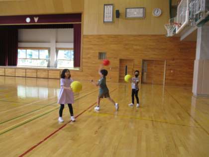 今日は、下学年が体育館を利用できる日でした。ボールを使ってソフトバレーをする子供やボールを高く上に投げて手をたたいて競っている子供もいました。ネットにボールが引っかかる場面が見られましたが、子供たちは、それにボールをぶつけてとってみようとしていました。子供たちは遊びから多くのことを学習しています。