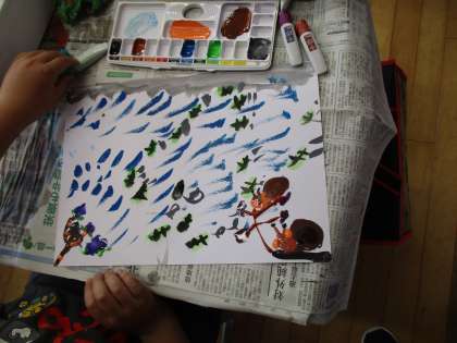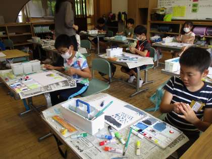 6月といえば何を連想するでしょうか?子供たちからは「プール開き」「カタツムリ」「春と夏の間」「アジサイ」など色々意見が出ました。子供たちは今まで学習したことをいかして色に水を多くつけたり、色を混ぜたりして絵を描いていました。