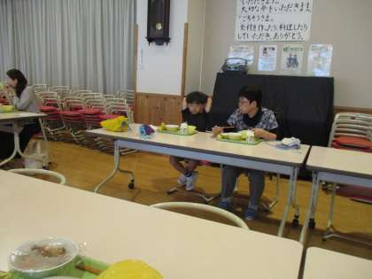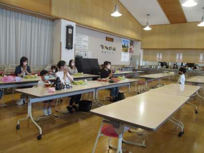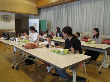 いつも食べている給食の様子を保護者の皆さんに見てもらい、一緒に給食を食べました。