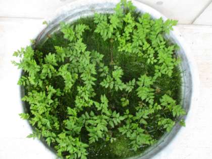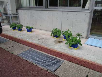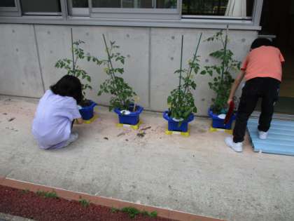 1年生教室の前はアサガオが大きく育っています。2年生教室の前はミニトマトが育っています。青い実がたくさんついています。3年生教室の前はメダカがいます。最近の暑さで水草が生い茂っていますがメダカはとても元気に泳いでいます。