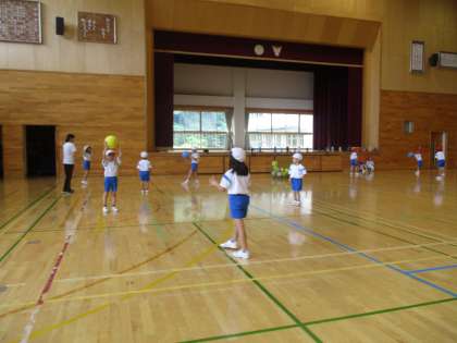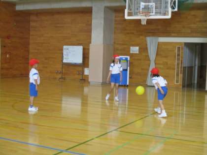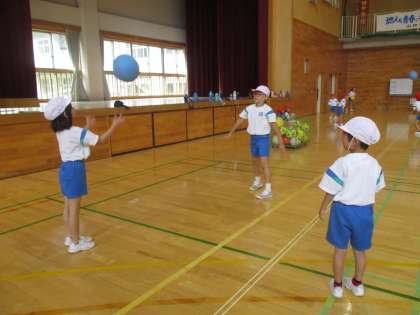 ソフトボール投げの練習をかねて、ボールを投げたり受け取ったりする練習をしました。「1分間で何回落とさないで投げられるか」というゲーム性を帯びると、子供たちの顔が一気に真剣になっていきました。