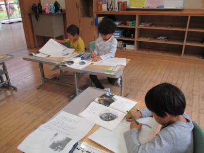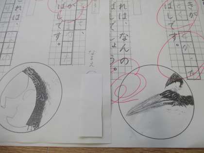 「きつつき」を例に、説明文の構成を学んだ後、「おうむ」「はちどり」で、「問い」と「答え」の文や、くちばしの特徴が書かれた言葉を自分で見つけました。また、絵を書いたり、動作化したりして、くちばしの特徴や使い方の違いを比べました。