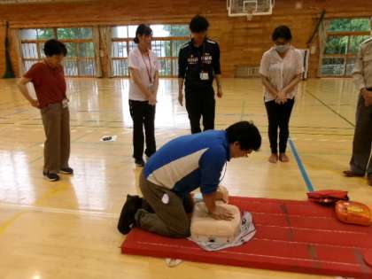 山田分遣所より講師をお招きし、心肺蘇生とAEDの講習会を行いました。子供たちが楽しみに待っている水泳学習を、楽しく充実したものにするためにも、安全への配慮にしっかりと取り組んでいきます。