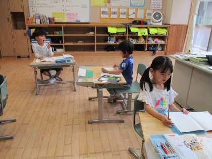 言葉の読み方や書き方を全体で確認した後、一人で取り組んだり、友達と一緒に考えたりしました。「じゃんぐるじむ」「きゅうしょく」「がくしゅう」「きょうかしょ」「じかんわりひょう」「じゃんけん」「しゃとるらん」など、子供たちは学習や生活の身近なものやことから多くの言葉を見つけ、とても楽しそうでした。ノートに正しい表記で書くこともできました。