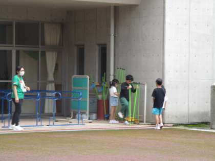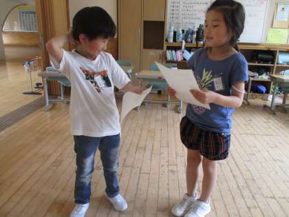 野菜の生長を観察している子供、中庭で遊んでいる子供、台詞をいう練習をしている子供などさまざまです。みんな自分で考えて行動しているのでいきいきしています。