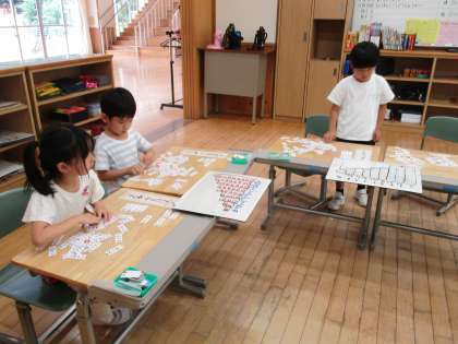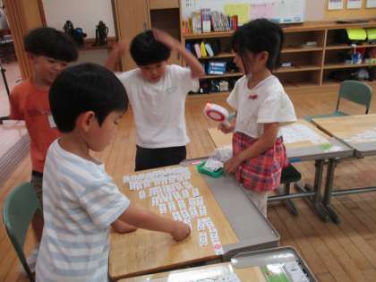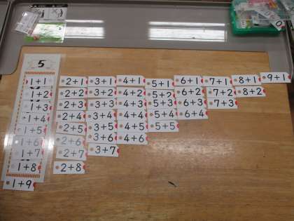 また、いくつかのカードを裏返したり、取ったりしても、並び方のきまり・特徴を生かして正しい式が言えるか、問題を出し合って確かめました。