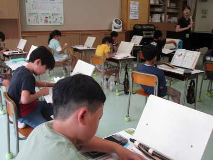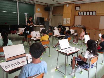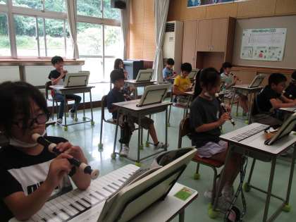 新しく「ファ」と「ミ」を練習しました。笛で右手も使うことになった子供たち。「先生、聞いてね。ここまで出来るようになったよ」子供たちは一生懸命、新しいことに取り組んでいます。