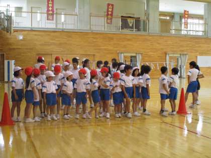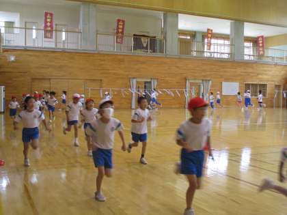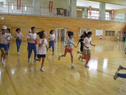 チャレンジタイムは体育館を走りました。暑い中、子供たちは自分の体調を考えながら走っていました。