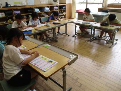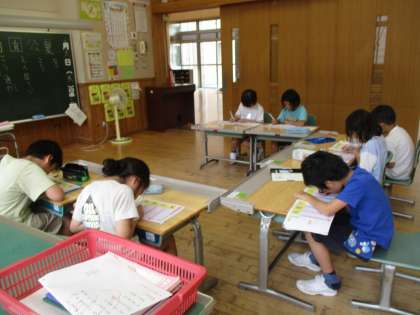 前の時間は体育で水泳学習に取り組みました。子供たちはしっかり泳いでへとへとの様子です。しかし、次の時間には漢字の学習にしっかり取り組んでいました。一文字一文字、とても丁寧に書いていました。