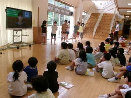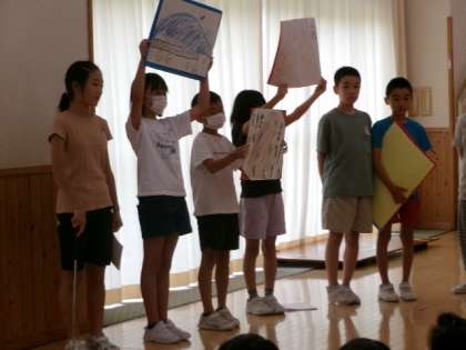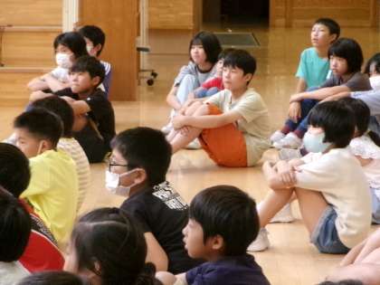 全校が集まった場では、5年生がBFC(少年消防クラブ)で学んだことをもとに、災害から命を守る方法について、全校に発信しました。