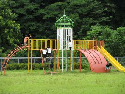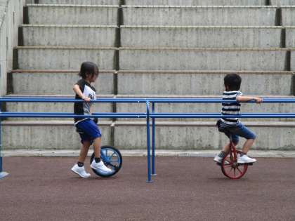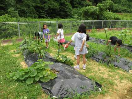遊具で遊んでいる子、キュウリや枝豆を収穫している子、一輪車を練習している子など、昼休みはそれぞれが楽しそうに活動しています。