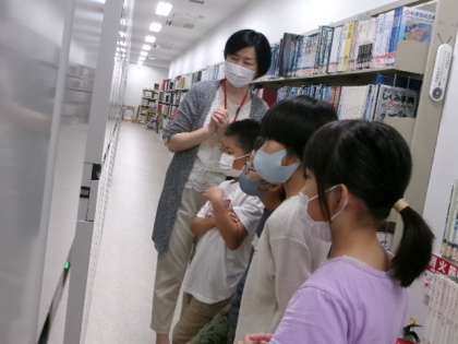 建物の特徴を聞いたり、展示されているガラス作品を鑑賞し、感じたことを交流したりしました。市立図書館の書庫では、本棚を動かすボタンを操作させてもらいました。美術館や図書館でのマナーも教えていただきました。