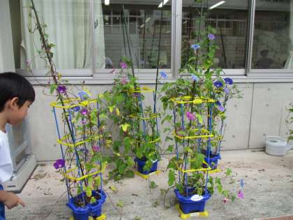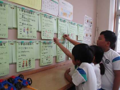登校するとすぐに子供たちの活動は始まります。野菜の収穫を喜ぶ子供たち。アサガオに毎日水やりをする子供たち。1学期のめあてを守れているかをふり返る子供たちなど様々です。