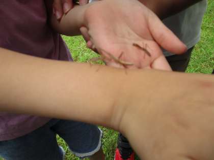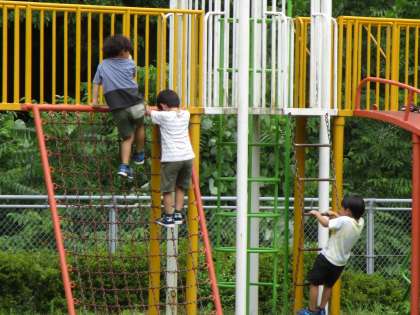 「カマキリの赤ちゃん見つけたよ」「もっといるかもしれないからもう一回探そう」遊具の下は虫の宝庫のようです。「やっぱりまだいたよ、カマキリ」2学期には大きくなったカマキリが見られそうですね。