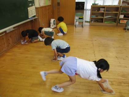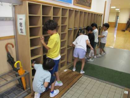 学習や生活でたくさん使った教室を水拭きできれいにしたり、下足箱の掃除をしたりしました。気持ちよく2学期が迎えられますね。