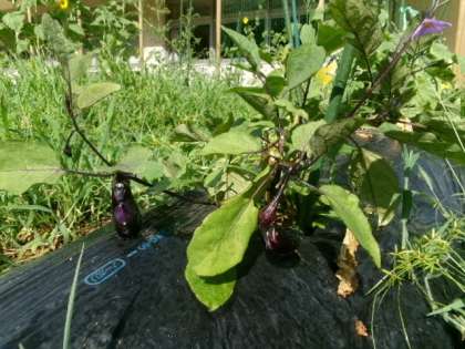 学校の畑は、ヘチマやひまわりの花が咲いています。なすやきゅうりなどの野菜も実っています。カボチャのつるは、芝生広場のほうにどんどんのびでいます。