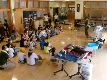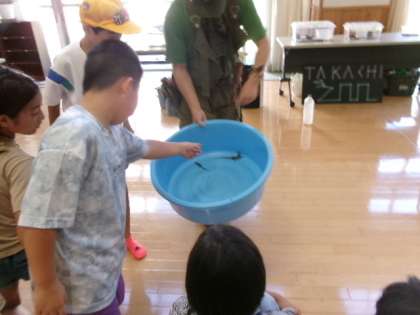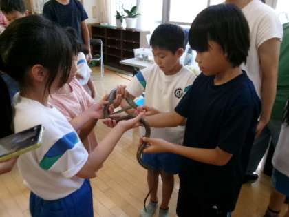 環境整備作業の後は、PTA主催の親子ふれあい活動「タカチ動物園」を行いました。フリーラーニングスペースが「動物園」になり、子供たちは、カエルヤヘビ、トカゲなどなど、いろいろな動物のお話を聞かせていただきました。最後は実際に動物に触ったり、写真を撮ったりしました。