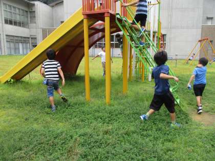 「トンボ、大発生してるね」中庭にでると、どの子供たちもそう言います。子供たちはトンボが飛んでいる空の下、セミの声をききながら遊んでいます。