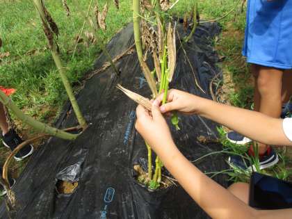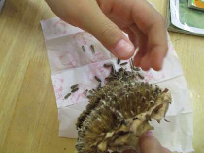 理科の学習で植物の育ち方を学習している子供たち。今日はオクラから56個、ヒマワリからは144個の種がとれました。「1個の種からこんなにとれた」と大喜びでした。