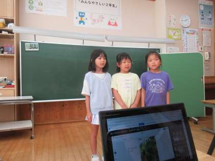 光陽小学校の2年生さんとオンラインで交流会をしました。小学校の特徴について紹介しあいました。子供たちからは、山田小学校と同じところ、違うところを感じていました。次回は、「山田のすてき」を紹介します。