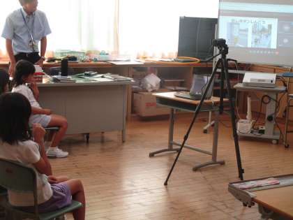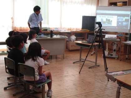 子供たちは光陽小学校の学校のまわりの様子をきいています。色々なお店が小学校のまわりにあるという発表を聞いて子供たちが顔を見合わせていました。今度は山田小学校の素敵なところを発表する番です。
