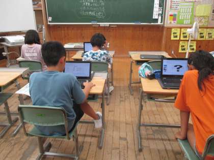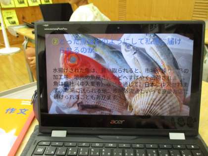 水産業の特徴をクロムブックにまとめています。教科書や資料集、図書館の本を調べてまとめていました。水産業の課題がたくさんあることがわかりました。