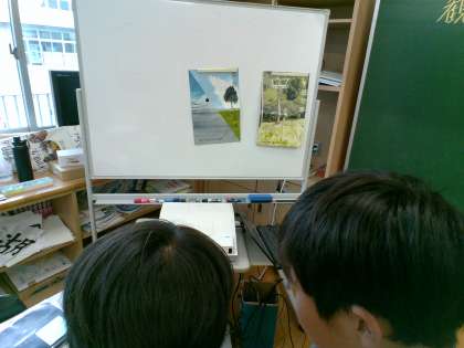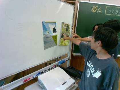 牛岳スキー場をPRしようとポスターを作成しています。写真や文字の色を変え、他の人たちにどちらのポスターが見やすいか聞いていました。