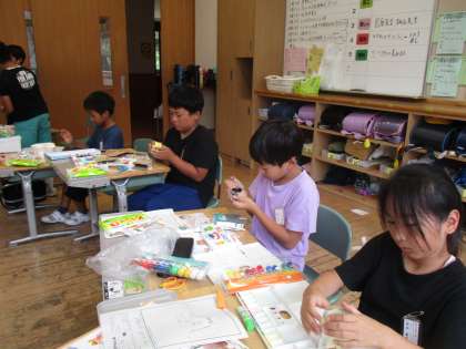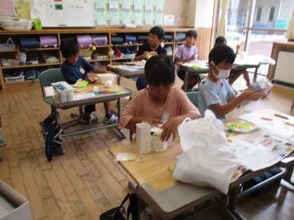 あき容器が形を変え、色を変え、用途を変えていきます。どんなものができあがるでしょうか。ペン立てをつくる子、カード入れを作る子など様々です。