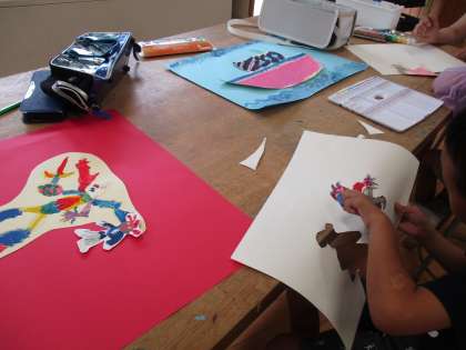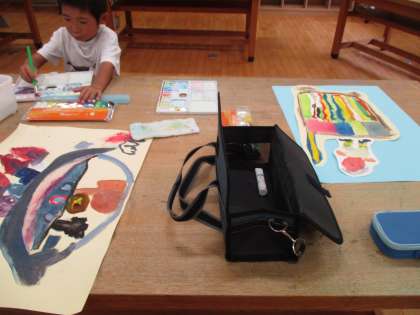 のってみったいものが完成しました。次は乗っている自分を絵の具で描きます。「マーブリングで服を作りたい」「スパッタリングでスーツケースをかっこよくしたい」「敵をつくりたい」時間が足りないほど想像力が膨らんでいます。