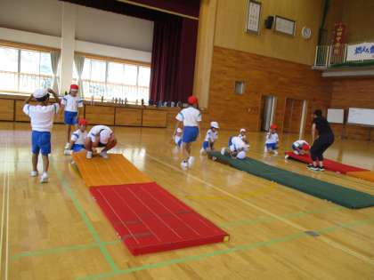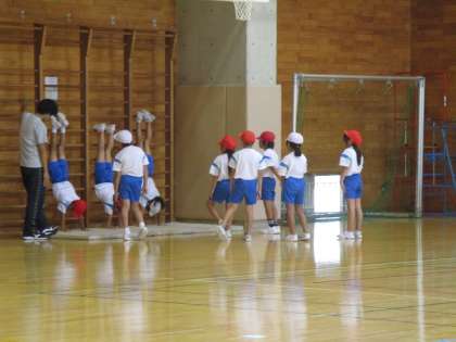 準備体操をしっかり行い、マット運動です。少し怖いなという気持ちは当然です。少しずつ技に挑戦している子供たちはとても素敵な顔をしています。