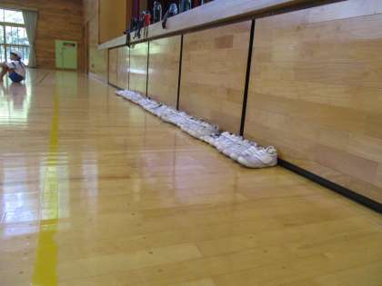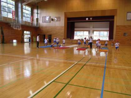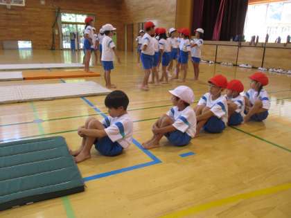 マット運動を通して学ぶことは、技だけではありません。すばやく並んできれいに整列する、靴を並べる、回りの安全を確かめるなど、モラルやマナーも学習しています。