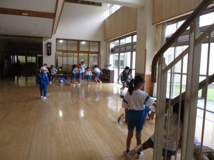 雨の日はフリーランニングスペースで下学年合同のだるまさんころんだが始まります。学年をこえて遊べるのは山田小学校の良いところです。