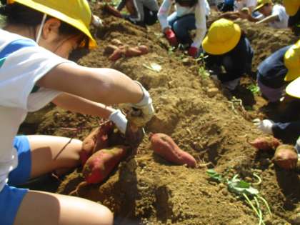 「土を掘るのって大変」「大きいサツマイモがとれたよ」「こっち手伝ってよ」たくさんサツマイモが収穫できました。これらのサツマイモは次はどうなっていくのでしょうか。