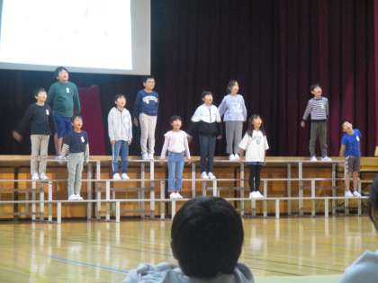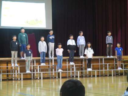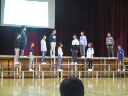 一人一人の台詞がいくつもある3年生。子供たちは友達の台詞もしっかりおぼえています。前をむいて声の大きさや抑揚をつけて表現豊かに発表に臨んでいました。