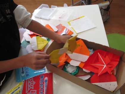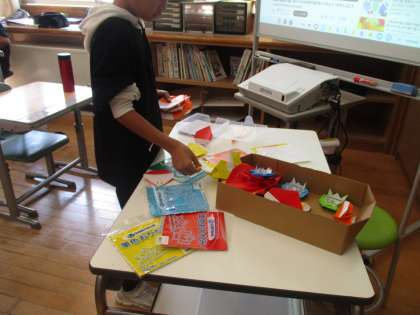秋を連想するもの。クリ、キノコ、スズムシなどがあります。子供たちは折り紙を使って各々それらを作っていました。