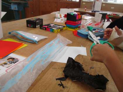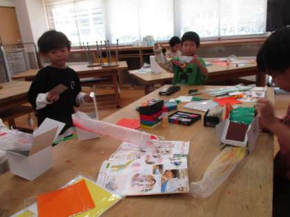 子供たちは袋や箱にシールをつけたりマジックで絵を描いたりしていました。「え、もう時間なの?」時間も忘れるくらい夢中で作っていました。
