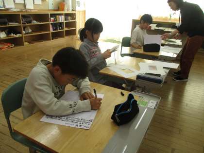 国語科の授業です。子供たちは伝統工芸の紹介とその良さを文章に入れてました。リーフレット作りは今後の色んな学習活動にいかすことが出来ます。