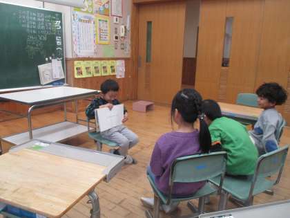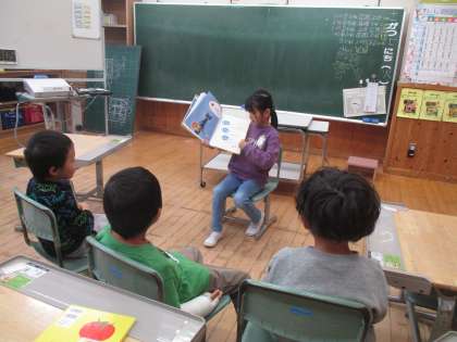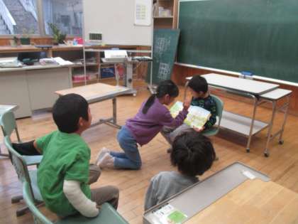 子供たちは授業の合間や休み時間を使って読み聞かせの練習をしています。抑揚をつけたり顔の表情を変えたりして工夫していました。