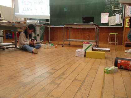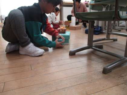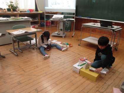 家からたくさんの空き箱を持ってきた子供たち。箱を使って大砲を作ったりタワーが出来ないかを工夫していました。子供たちはあそびの中からかたちの特徴を学んでいきます。