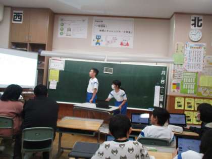 来週の金曜日は山田の特産物を使った給食が出る日です。子供たちは給食の献立の内容を下学年にもわかりやすく説明する練習をしています。