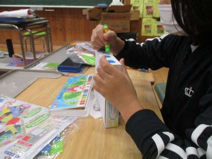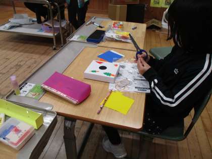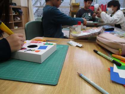 子供たちは厚紙を使って弦楽器を作っています。「弦をもう少し増やしたらどんな音がでるかな」「可愛い楽器にしたいな」子供たちは自分たちで作った楽器を鳴らしながら試行錯誤していました。