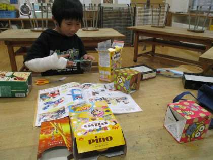 家で、いろいろな大きさの箱をたくさん集めてきた子供たち。「自動車にしようかな」「ガチャガチャ作ろうかな」「動物にしようかな」など、手にした箱を見ながら作品への想像がふくらみます。完成が楽しみです。
