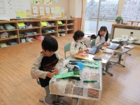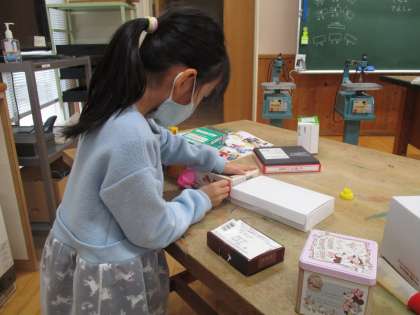 家で、いろいろな大きさの箱をたくさん集めてきた子供たち。「自動車にしようかな」「ガチャガチャ作ろうかな」「動物にしようかな」など、手にした箱を見ながら作品への想像がふくらみます。完成が楽しみです。