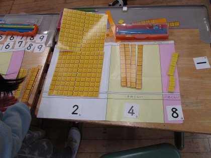 数カードとブロックを使って百の位を学習しました。「あいている位は0をいれるよ」「010で10かな」「百の位に0はいるのかな」学習をすすめると新たな疑問も出てきます。